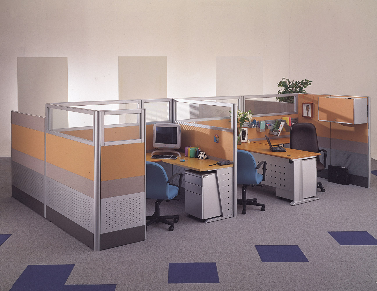 屏風(fēng)組合工作位美觀大方,簡便清巧,配以玻璃,更顯出良好的工作氛圍。屏風(fēng)組合體現(xiàn)團隊空間需要結(jié)合個人奮斗與團隊合作,既允許團隊個體之間有合理的隱私,也鼓勵大量的溝通交流,更方便了管理團隊。
